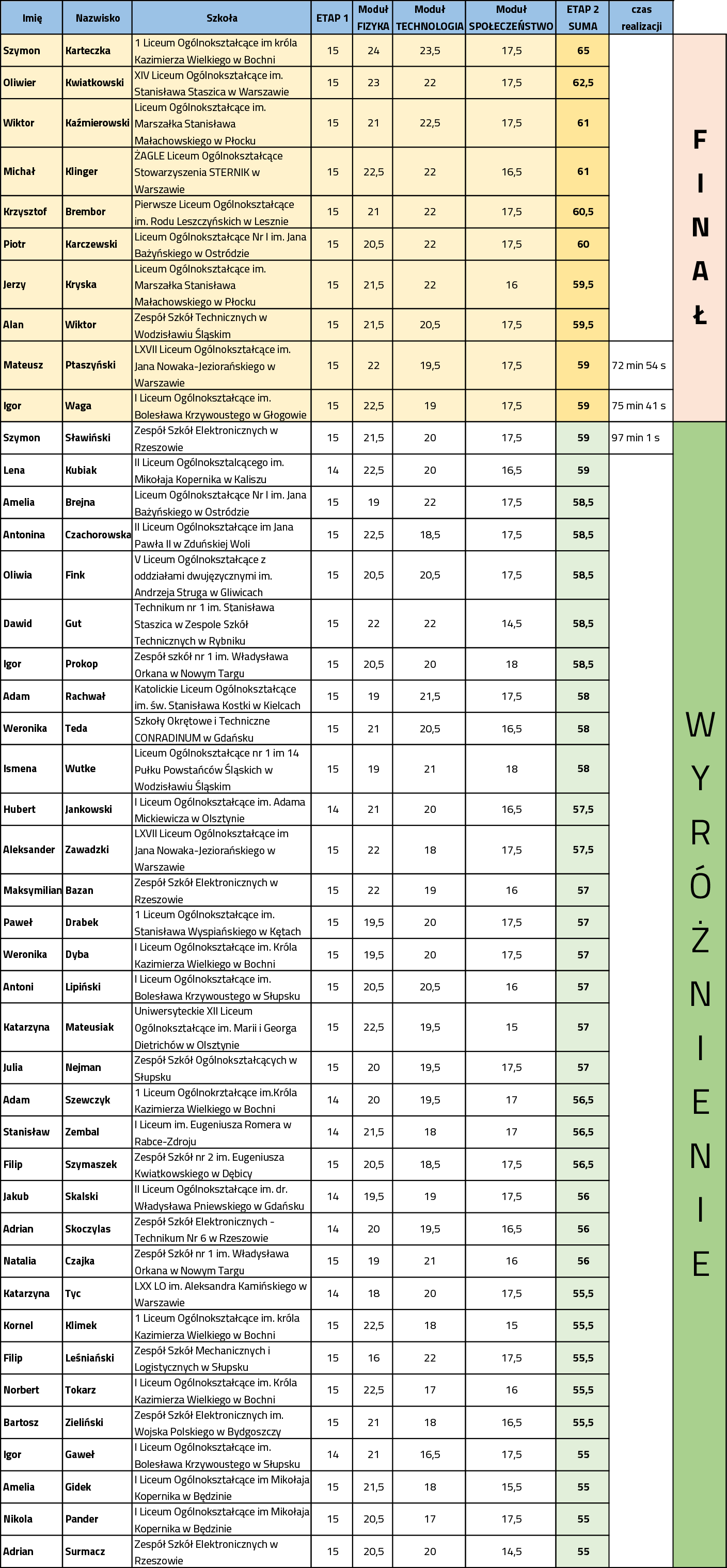 - Pytania zamknięte oceniane są automatycznie, krótkie pytania otwarte ocenia Komisja Konkursowa. Wynik Etapu 2 to suma punktów z trzech modułów i on decyduje o miejscu w rankingu do finału (szczegóły remisów – patrz Regulamin, §4 i §5).