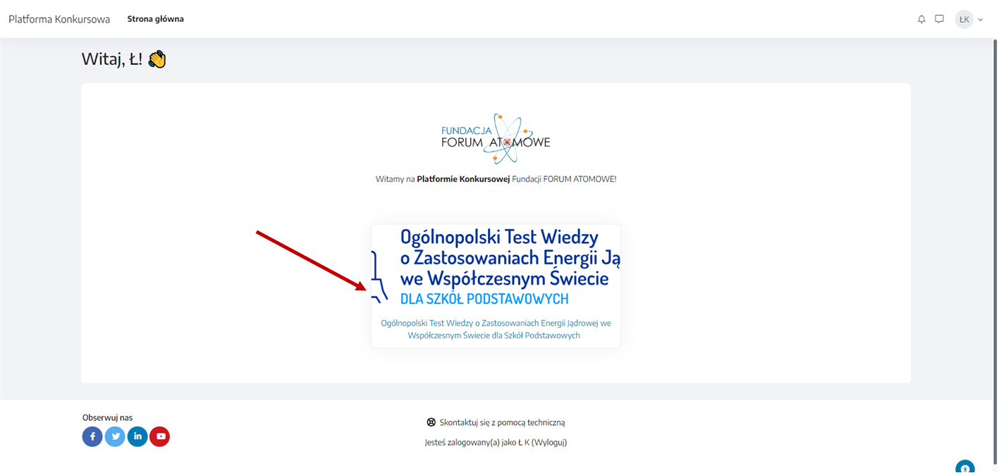 Następnie pojawi się ekran powitalny platformy konkursowej. Aby przesłać formularze zgody, a następnie pracę konkursową należy kliknąć w link >Konkurs „Poskromić Atom”<.